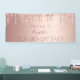 Une bannière pour une fête du 50e anniversaire, girly et glamour. Un arrière - plan métallique à l'aspect faux rose d'or avec un élégant faux or rose, gouttes de parties scintillant rose, look goutte à goutte de peinture. Le texte : Bienvenue à, et un nom écrit en or rose foncé avec un grand script de style écrit main moderne.