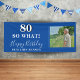 80 Alors Quelle Bleue Amusante Photo 80e Anniversaire Bandeau de fête. Signe de fête pour la fête du 80ème anniversaire avec une photo personnalisée, inspirant et drôle dire 80 alors quoi et texte dans un script blanc tendance avec un nom. L'arrière - plan est bleu. Personnalisez le panneau avec votre photo, votre nom et votre numéro d'âge, et faites de votre fête d'anniversaire une bannière amusante pour une personne avec humour.
