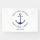 Nom de bateau ou nom de famille personnalisé, Bienvenue à bord, ancre de marine nautique bleue et texte blanc pour la maison ou l'entreprise bannière enseigne personnalisée.