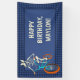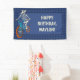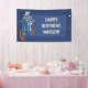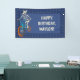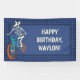 Cette bannière est prête à être personnalisée avec votre propre message. Des lettrages de couleur ivoire sont posés sur un fond bleu foncé et accompagnent mon illustration de style bande dessinée dessinée à la main d'un squelette loup-garou conduisant un vélo BMX. La bannière a une bordure à motif à carreaux bleue sur fond bleu. C'est parfait pour célébrer les enfants qui aiment faire du vélo BMX ou pour votre fête ou événement spécial avec un thème de cyclisme.