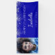 Célébration d'un 21e anniversaire (ou de tout âge) pour une fille/femme. Un arrière - plan bleu royal. Décoré avec de la poussière de parties scintillant en faux argent. Personnalisez et ajoutez votre propre photo de la fille d'anniversaire. Utilisez une photo verticale/portrait. Le texte : Le nom est écrit avec un script de style à la main moderne. Personnalisez et ajoutez un nom, 21 ans et une date. Peut être utilisé à la fois comme bannière de bienvenue ou décoration murale de fête.