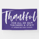 Dites merci aux enseignants et au personnel de l'école avec cette bannière personnalisée. Parfait pour la semaine de l'appréciation des enseignants, la fin de l'année scolaire ou même le début d'une nouvelle année, ce panneau présente un arrière - plan violet avec un script moderne amusant et reconnaissant avec votre texte personnalisé qui peut inclure l'année scolaire ou un remerciement à des personnes spécifiques.