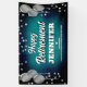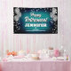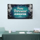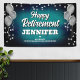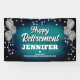 Fun banner sign for indoors or out, featuring festive silver metallic balloons on both sides of the design with sparkly, silver metallic confetti on a rich textured aqua blue background for your personalized retirement party banner.