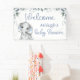 Sympathique panneau de bannière d'accueil baby shower personnalisé avec un éléphant d'aquarelle douce tenant un lapin farci dans les tons bleus accentué de vert sauge et bleu poussiéreux vert et des feuilles d'eucalyptus avec typographie de script de calligraphie. ASSISTANCE : Pour obtenir de l'aide sur la modification/la personnalisation de la conception, le changement de couleur, le transfert de la conception vers un autre produit ou si vous souhaitez coordonner des éléments, contactez le concepteur AVANT DE COMMANDER via l'onglet MESSAGE Conversation Zazzle ou par courriel à l'adresse makeitaboutyoustore@gmail.com.