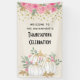 Banderole d'action de grâce avec des citrouilles blancs d'aquarelle fantaisie avec des accents de fausse parties scintillant or. Entouré de feuilles verts et de fleurs sauvages roses. Un bouquet de roses le long du sommet avec des confettis d'or faux en dessous.