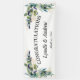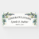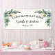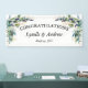 Cette bannière de Mariage Floral d'Eau d'Été est conçue en branches d'eucalyptus bleu doux avec des reflets dorés. Le texte comprend : FÉLICITATIONS, les prénoms de la mariée et de la mariée et la date du Mariage. Pour personnaliser, il vous suffit de remplacer l'exemple de texte en utilisant notre modèle facile. N'oubliez pas de consulter la collection de Mariages d'aquarelle d'été pour les cartes et la papeterie de réception correspondantes.