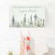 Bienvenue dans votre pavillon de montagne ou mariage de bois avec cette bannière personnalisée. Il présente un style simple mais élégant avec un accent illustrant une forêt de pins d'eau ou de à feuillage persistant arbres dans les tons vert sauge, gris et vert pâle. L'aquarelle douce a une qualité calme et paisible, qui vous rappellera que le brouillard se lève sur un vitrage boisé. Le lettrage classique et élégant dans un vert à la sauge foncée coordonnant les noms de la mariée et du marié.