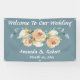 Cette élégante bannière Mariage d'été aquarelle florale est conçue avec un ensemble de fleurs d'été dans les tons muets crème et taupe, sur un arrière - plan bleu vert. Le texte comprend : Bienvenue à Notre Mariage, Les Noms de Mariée et de la Chambre et la Date du Mariage en blanc. Pour personnaliser avec vos détails, insérez simplement votre texte dans notre modèle facile, en remplaçant l'exemple.