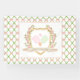 Cette bannière de pickleball a une image aquarelle d'une crête entourée de branches avec des pagaies de pickleball vert et rose en vichy au centre. Le design a un motif de treillis vert avec des arcs roses autour du bord avec le même motif à l'arrière. Les couleurs utilisées comprennent le vert mousse, le rose roux et le bronzage. Le texte dit "Faisons un coup à la Cour."