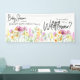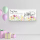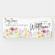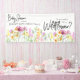 Bannière de baby shower fleur sauvage avec jolie bordure fleur sauvage aquarelle et belle lettrage à la main. Le design présente des fleurs délicates en rose, lilas, orange et jaune et populaire en disant "est-ce que vous pensez qu'elle est fleur sauvage ?" Le modèle est prêt pour vous à personnaliser avec le nom de votre mère à être.