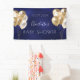 Un arrière - plan bleu marine. La couleur bleue est inégale. Décoré de ballons d'or. Personnalisez et ajoutez un nom, une date. Lettres blanches. Le nom est écrit avec un script de style moderne écrit à la main.