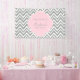 Motif en chevron gris et blanc avec bannière d'accueil baby shower rose pastel. Zigzag gris et blanc et au centre il y a une forme de quatrefoil rose pastel avec votre texte personnalisé.