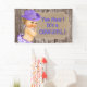Bannière de baby shower rustique violette avec adorable cowgirl violette sur un burlap rustique et arrière - plan en bois en détresse. Cette jolie bannière de baby shower de cowgirl violet est facilement customisée pour votre événement en ajoutant votre texte personnalisé dans le style de police de votre choix. Il s'agit d'un dessin imprimé sans véritable burlap, etc.