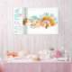 Bannière de baby shower tribal de filles avec petite fille mignonne portant des vêtements indiens indiens pastel turquoise sur un joli arrière - plan design aztèque pastel. Vous pouvez ajouter le texte de votre choix personnalisez cette adorable bannière de baby showers tribaux boho pour votre événement.
