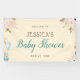 Cette élégante bannière de baby shower présente des fleurs douces, agrémentées de verdure et de plumes. Un autre graphique dans le coin inférieur gauche présente des boîtes cadeaux avec ballons. La bannière offre de nombreuses couleurs qui font est parfait pour un baby shower neutre de genre.