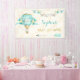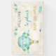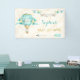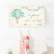 Ballon à air chaud en bleu turquoise, turquoise, aqua, or, jaune & gris avec flèches & roses. Une place sur la bannière à personnaliser avec un nom ou une phrase. Sur un arrière - plan d'aquarelle or.