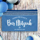 Soyez fier, réjouissez-vous et mettez en valeur ce jalon de votre Bar Mitzvah préféré ! Accrochez cette bannière cool, unique, moderne et personnalisée pour ajouter à son jour spécial. Une typographie en script blanc gras, une étoile de David et un graphique inspiré du tallit rayé bleu marine et argenté sur un fond simple bleu bleuâtre. Personnalisez le texte personnalisé avec le nom et la date de votre Bar Mitzvah ou un message personnalisé. Garantit de préserver les souvenirs chéris de son occasion spéciale ! Des invitations, des étiquettes d'adresse, des autocollants, des classeurs souvenirs et d'autres cadeaux de Bar Mitzvah assortis et coordonnés sont également disponibles dans cette collection tendance et spéciale.