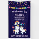 Une bannière d'anniversaire avec 2 mignonnes licornes dansantes avec queues vives et colorées, et crinière. Un arc-en-ciel coloré avec des nuages de chaque côté au-dessus de la tête. D'autres éléments comprennent une petite fleur au coeur et quelques étoiles. Arrière - plan violet foncé. Des points de confettis colorés et une image de bannière de bunting le long du sommet.