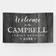 Bienvenue à la réunion familiale rustique grange bois Banner. Ajoutez votre propre nom de famille et votre année personnalisée. Modèle design vintage avec typographie élégante. Parfait pour la réunion de famille, barbecue, réunion, fête du jardin, réunion et célébrations. Décorations personnalisables pour la fête festive. Des panneaux extérieurs et intérieurs pour les familles se rassemblent et se réunissent.