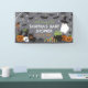 Bannière baby shower d'Halloween mignonne avec un bébé est le thème brassant avec un fantôme sorcier, un chaudron brassant quelque chose de vert et de bulle, deux chats et citrouilles et un crâne et un corbeau, chauves-souris volantes et champignons et araignées dans une palette de couleurs Halloween neutre genre. Bannière de baby shower Halloween neutre pour les femmes avec un bébé est thème brassant avec des illustrations curieusement mignonnes.