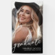 This simple and minimalist graduation party vertical banner features a full-length photo with a black gradient at the bottom, overlaid with white text for a sleek, modern look. “Graduate” is displayed in elegant handwritten script, with the graduate’s name, “Class of 2026,” and the school name shown below in clean white fonts for a bold, easy-to-read design.