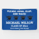 Ajoutez aux festivités de graduation d'un diplômé pendant les temps Coronavirus avec ceci s'il vous plaît klaxonner et saluer bannière bleue! Si vous ne pouvez pas avoir de fête de remise de diplômes, alors faites une parade de voiture ! Personnalisez avec le nom du diplômé, l'année de diplôme, le nom de l'école ou d'autres messages personnalisés.