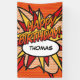 Customisez avec le nom de la fille ou du garçon d'anniversaire et créez un cadeau unique juste pour eux. Une bannière d'anniversaire amusante, cool et tendance rétro de bande dessinée pop art qui met le wham, zap, pow dans votre événement spécial de célébration. Conçu par ComicBookPop© à l'adresse www.zazzle.com/comicbookpop