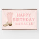 Cette bannière d'anniversaire à thème de cowgirl présente une grosse botte rose sur la gauche avec les mots "heureux anniversaire" sur la droite. Vous pouvez personnaliser avec un nom.