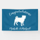 Inclure le grand frère ou la soeur en fourrure bébé dans la fête avec cet adorable baby shower de chien carlin! Parfait pour un amoureux du chiot avec un bébé en route. Le carlin est à côté d'une adorable calèche vintage. L'arrière - plan bleu est parfait pour un bébé en route ! Aussi un design idéal pour les douches à chiot!