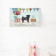 L'illustration originale de Destei d'un mignon chien de race Carlin couleur manteau noir. Le chien est placé dans un cadre d'anniversaire coloré. Il y a un gâteau d'anniversaire avec quelques bougies dessus, des ballons d'anniversaire colorés et une bannière de bunting ainsi que deux boîtes de cadeaux. Vous trouverez également une zone de texte personnalisable.