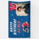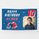 Bannière de fête d'anniversaire de photo de dessin animé de casque de ballon de football. Fond de fête d'anniversaire de football moderne et amusant. Avec une illustration de dessin animé audacieuse d'un ballon de football et d'un casque en rouge et bleu. Ajoutez votre photo, nom et âge.