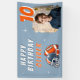 Bannière de fête d'anniversaire de photo de dessin animé de casque de ballon de football. Fond de fête d'anniversaire de football moderne et amusant. Avec une illustration de dessin animé audacieuse d'un ballon de football et d'un casque de couleur orange et grise. Ajoutez votre photo, nom et âge.