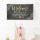Modèles de bannières de bienvenue Mariage moderne - Elégant Script or et cadre floral blanc sur Grunge Black Chalkboard Arrière - plan. Un design parfait pour votre grand jour. Tous les styles de texte, couleurs, tailles peuvent être modifiés selon vos besoins !
