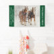 Bannière personnalisée de la fête de Noël avec une photo extérieure montrant une équipe de 2 chevaux belges tirant un traîneau. Des flocons de neige tombent doucement avec des pins enneigés dans l'arrière - plan.