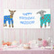 Cette bannière de fête personnalisée présente des illustrations de style mignonne et réaliste de chèvres en pyjama, ce qui en fait un endroit parfait pour les soirées en sommeil. Cette bannière est prête à être customisée avec votre propre message en lettres bleu vif.