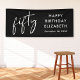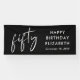 Banderole de fête noire chic 50ème anniversaire et signe de bienvenue avec "cinquante" dans un script blanc élégant et votre nom et la date en lettres blanches modernes.