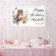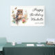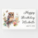 Bandeau de fête d'anniversaire avec la peinture d'une petite chouette mignonne assise parmi les fleurs dans les branches d'un arbre. Personnalisé avec le nom de l'invité d'honneur. Contactez-moi pour obtenir de l'aide sur vos personnalisations ou pour demander des produits Zazzle correspondants ou coordonnés supplémentaires pour votre célébration.