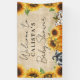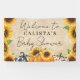 Cette belle bannière présente trois citrouilles adorables en plaid orange, noir et blanc, et empreinte de léopard sur un imprimé burlap. De jolis tournesols jaunes bordent les côtés de la bannière. "Bienvenue" dans une typographie cursive manuscrite est présenté en haut avec le nom de la maman-to-be et le "Baby shower" en dessous.