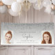 Bienvenue aux invités de la fête de remise de diplômes ou tout simplement annoncer son succès avec cette bannière photo chic et glamour, avec une bordure brillante en fausse parties scintillant argent et un arrière - plan gris argenté. Remplacez facilement les deux exemples d'images par des photos du diplômé. Personnalisez-le avec son nom en écriture manuscrite grise, avec l'année de classe et l'école en sans serif font. Parfait pour les baccalauréat ou collégial.