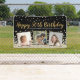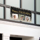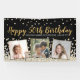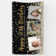 Conception élégante de bannière d'anniversaire personnalisée avec des confettis or et argent sur fond noir, typographie de script moderne avec les mots "Joyeux 50e Anniversaire" (en or), votre nom et date de naissance (en argent) et trois de vos photos préférées encadrées dans une feuille d'or métallique.