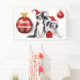 Une adorable aquarelle illustrant un collier noir et blanc à la frontière et un Setter anglais vous regardant porter un casquette de Noël. Elles sont encadrées de brins de ruban rouge festifs et de deux baubels d'arbre de Noël ainsi que d'un joli cadeau d'étoiles rouge et blanc. Un modèle pour votre salutation de Noël apparaît à travers le baubel unique dans une police de calligraphie de fantaisie blanche. Ils sont idéaux pour les amoureux de les chiens, les abris pour animaux, les cliniques vétérinaires et les centres d'embarquement.