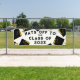 Félicitations à la remise des diplômes de niveau supérieur ou bannière de cérémonie avec casquettes classiques de graduation en noir et or. Modifier le texte pour modifier l'année de classe supérieure.