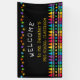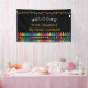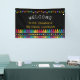 Une bannière de bienvenue personnalisée en classe portant le nom de l'enseignant sous des étoiles vibrantes et au-dessus d'une rangée de crayons dans un dégradé arc-en-ciel. Cette bannière de jardin d'enfants présente des crayons colorés et des étoiles dressées sur un fond noir, avec le nom de l'enseignant affiché dans une police jaune ludique. Bienvenue à l'école avec une bannière lumineuse et joyeuse!