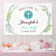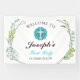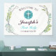 Cette bannière d'accueil de la Première Communion, sur le thème botanique bleu, est ornée d'un magnifique crucifix bleu turquoise, aux jolies fleurs bleues et aux feuilles verts. Personnalisez avec le nom de votre fils ou de votre fille pour une occasion spéciale supplémentaire.