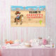 Faites savoir à votre invité qu'ils sont arrivés à l'anniversaire de votre enfant avec cette jolie bannière de fête avec un cowboy faisant un cheval à travers un arrière - plan du désert. Ajoutez facilement le nom et l'année de naissance de votre enfant. Parfait pour votre fête d'anniversaire à thème occidental. Facile à personnaliser avec des options personnalisées.