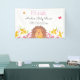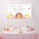 C'est une bannière de baby shower fille avec un adorable hérisson assis au milieu des fleurs d'été.