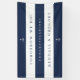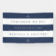 Bienvenue invités à votre dîner de répétition nautique, d'été ou de la côte avec cette bannière rayée bleu marine et blanc étincelante. Personnalisez avec trois lignes de texte personnalisé accentuées par deux illustrations d'ancre blanche. Montré avec "demain nous le faisons ! Félicitations [nom] et [nom]."