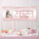 Félicitez votre diplômée qui aime étinceler avec une bannière de parties scintillant en or rose fillette glam personnalisée avec son nom avec éclat ajouté, sa photo et votre message personnalisé en gris (l'exemple dit FÉLICITATION À NOTRE DIPLÔMÉ) avec une année de classe modifiable en arrière. CONSEIL PHOTO : Pour obtenir les meilleurs résultats, choisissez une photo avec le sujet au milieu et/ou pré-rognez-la dans une forme similaire à celle montrée AVANT de télécharger. Contactez le concepteur via Zazzle Conversation ou makeitaboutyoustore@gmail.com si vous souhaitez modifier ce design sur un autre produit ou si vous souhaitez coordonner des éléments.