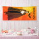 Bannière du Château de Dracula avec figure complète Dracula en cape noire tenant un chandelier avec éclat. Arrière - plan orange avec le texte "Venez à mon château." Dessiné par l'artiste Patricia Villa pour la fête d'Halloween.