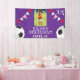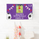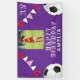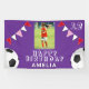 Bannière de fête d'anniversaire de photo de drapeaux de ballon de football de football violet. Le design comporte deux ballons de football et des drapeaux de guirlande de fête d'anniversaire en rouge, rose et blanc sur fond violet. Ajoutez votre photo et personnalisez-la avec votre nom, votre âge et votre texte et créez votre propre bannière de fête d'anniversaire. Idéal pour les garçons et les filles qui aiment le football, le football.